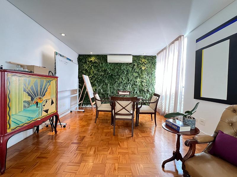 Área social com living em L para 04 ambientes, janelões com muita iluminação e ventilação, lavabo, 02 aparelhos de ar condicionado, som ambiente.