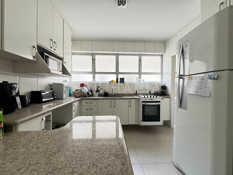 Cozinha com copa, janela, área de serviço com muita iluminação e ventilação, dependência e banheiro auxiliar.