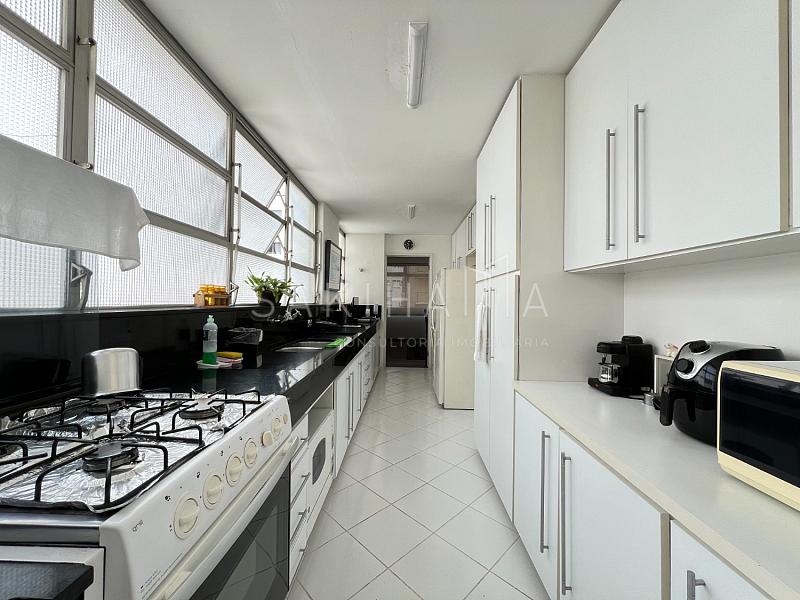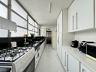 Cozinha com armários, janelas de ponta a ponta, área de serviço com dependência e banheiro auxiliar, passagem íntima com armários.