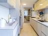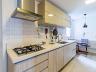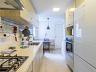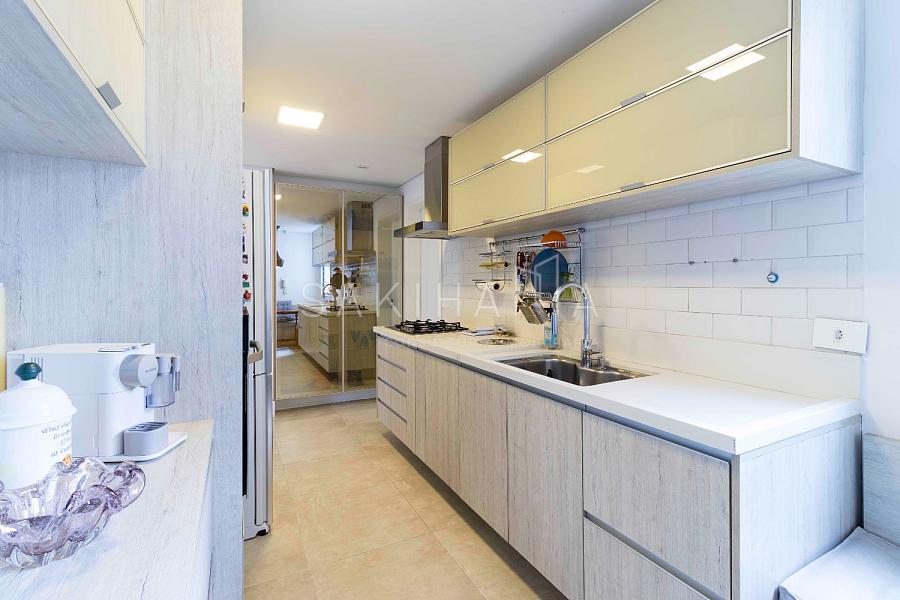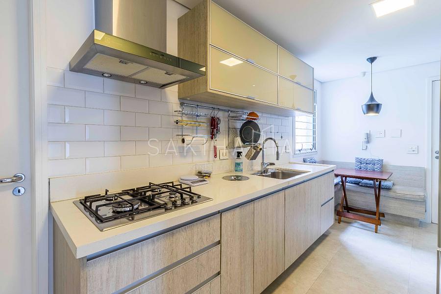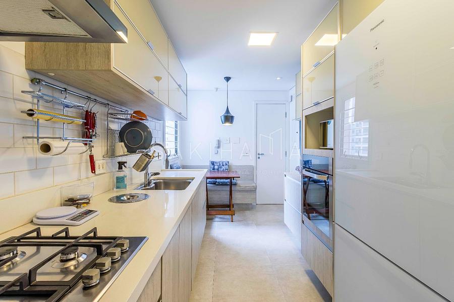 Cozinha com muitos armários, apoio de copa, janela dando maior luminosidade e ventilação no ambiente.