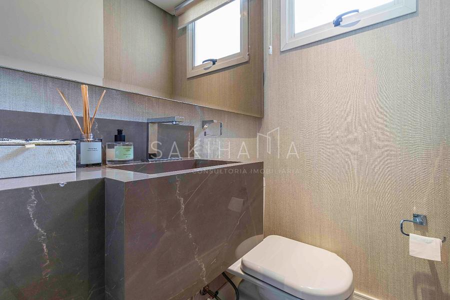 Varanda gourmet com churrasqueira a carvão além de contar com fechamento em vidro retrátil.