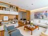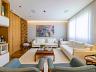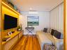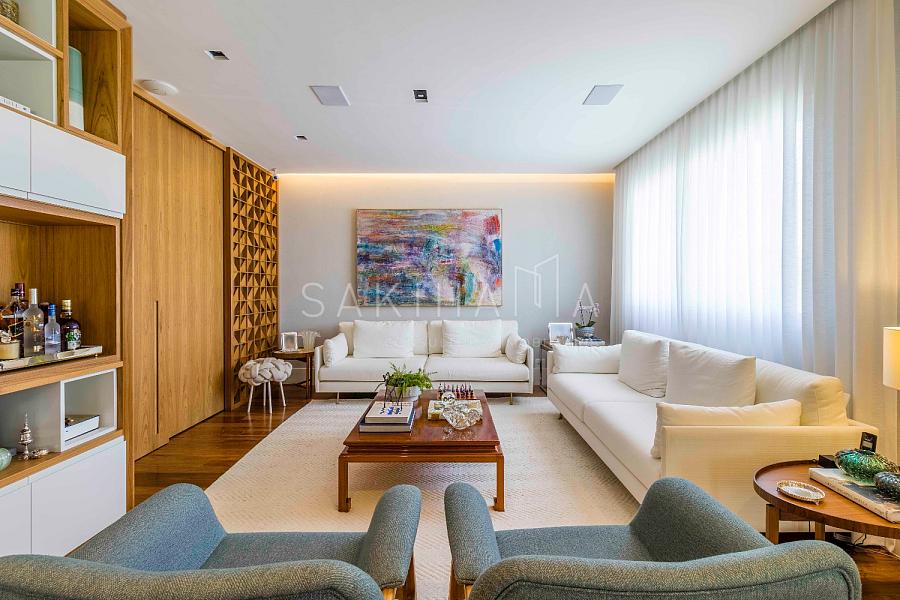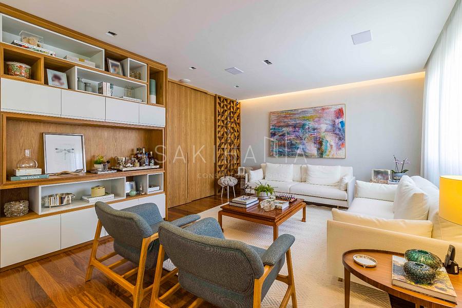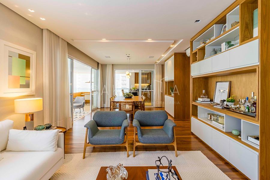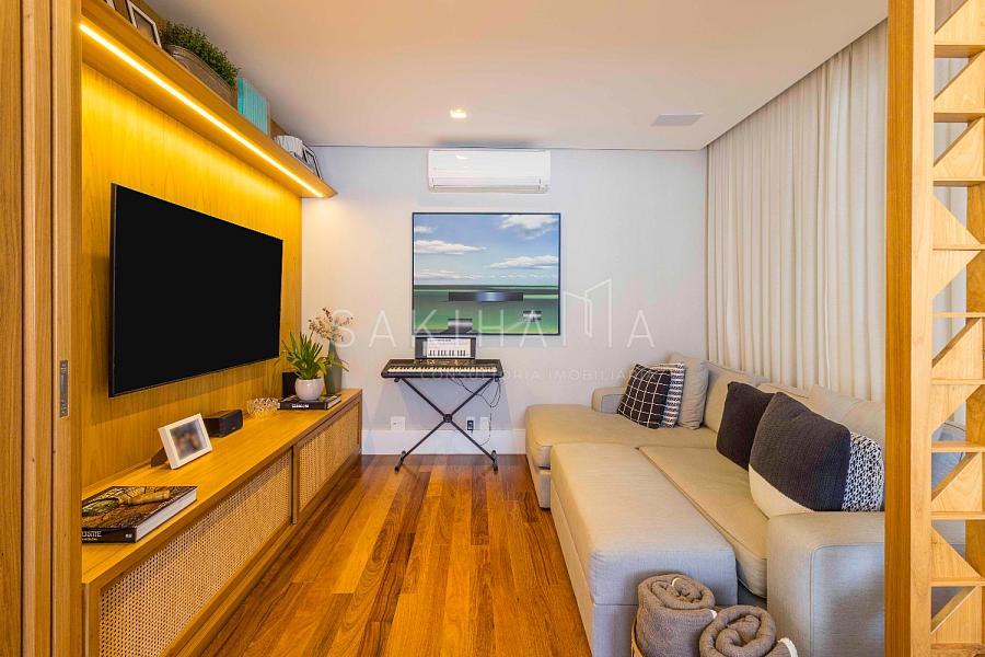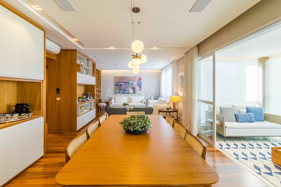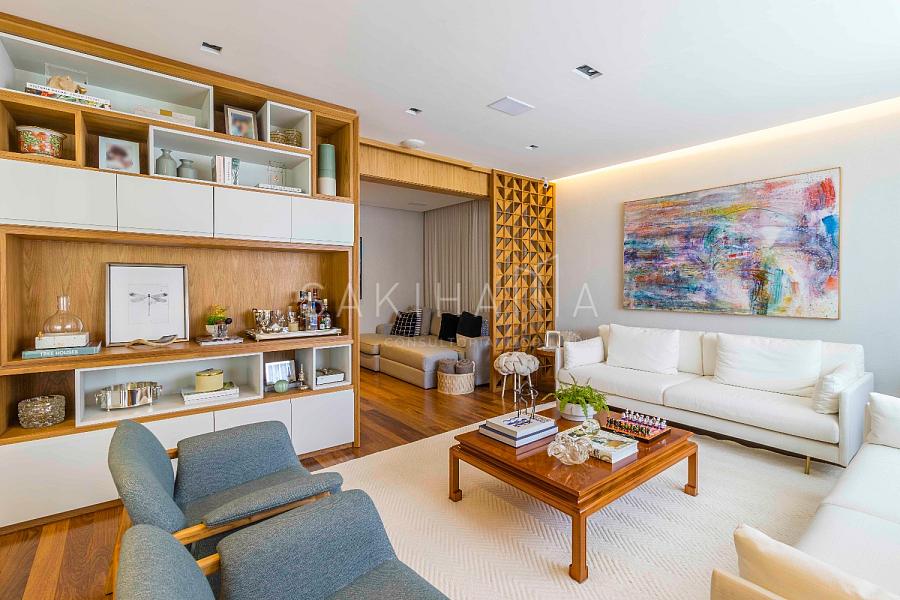 Amplo living com 03 ambientes: sala de estar, TV e jantar, automação e som ambiente, lavabo, painel de madeira no ambiente.