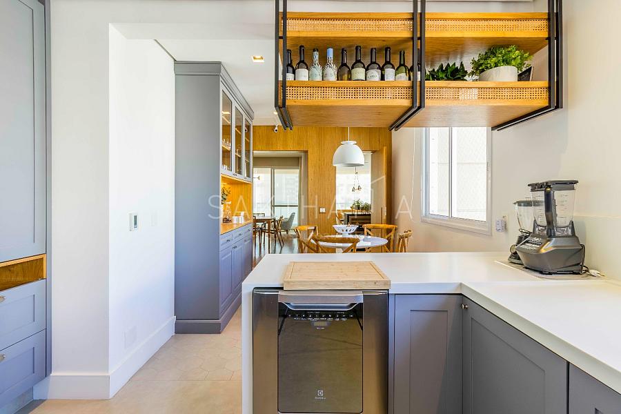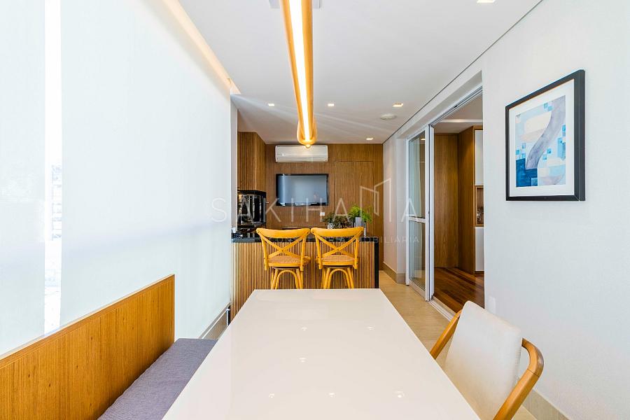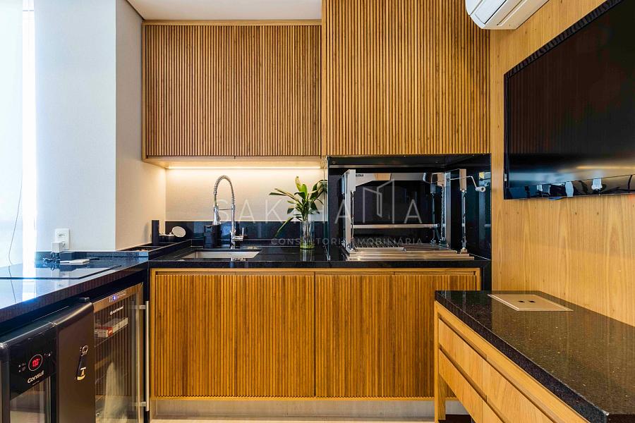 Varanda gourmet com churrasqueira, cooktop,  fechamento em vidro retrátil, cortina rolo, integração com a cozinha.
