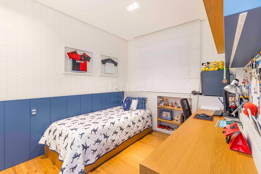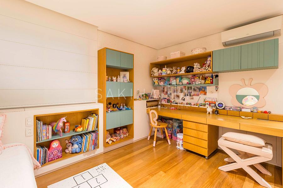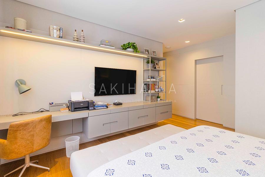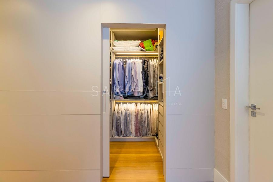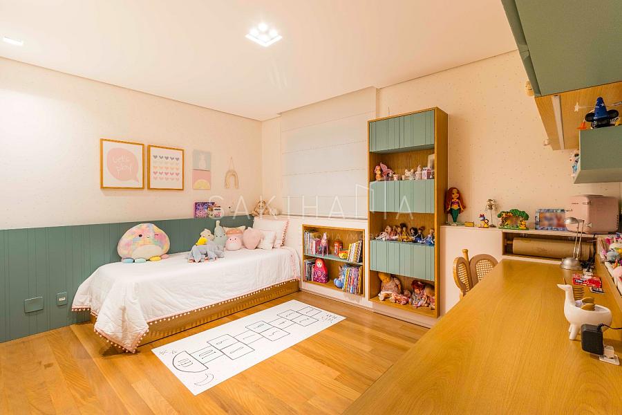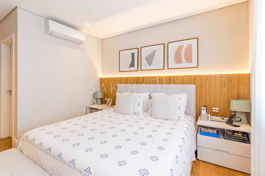 Suíte máster com walk in closet, cama king size, banheiro com cuba dupla, demais suítes com armários e espaço de escrivaninha, aquecimento no piso dos banheiros.