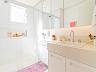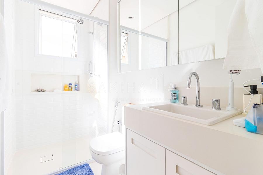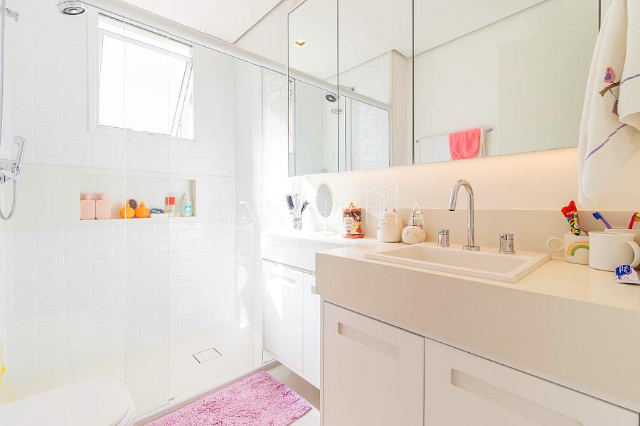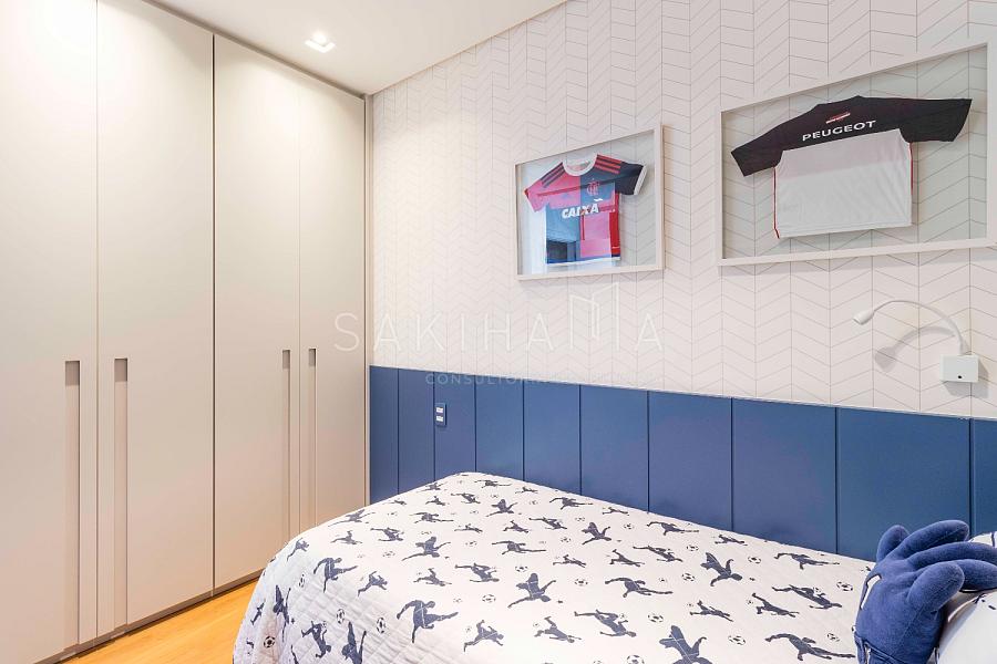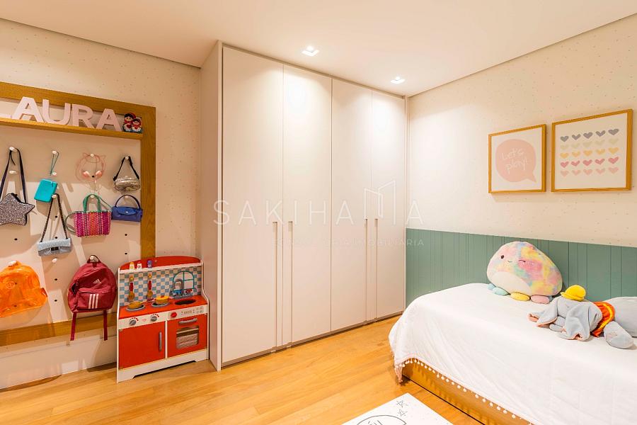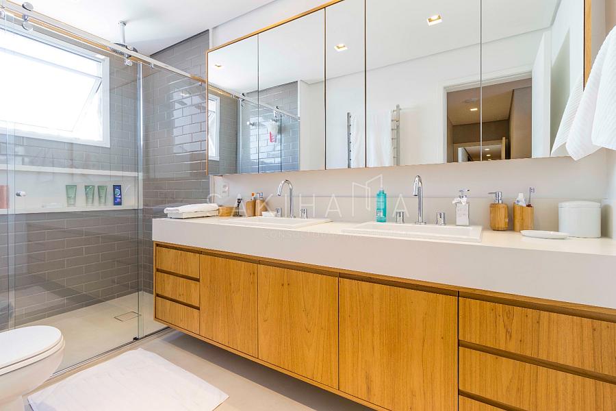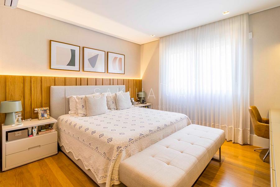 Suíte máster com walk in closet, cama king size, banheiro com cuba dupla, demais suítes com armários e espaço de escrivaninha, aquecimento no piso dos banheiros.