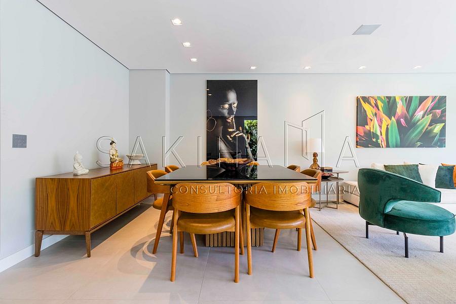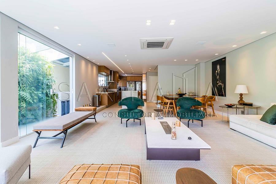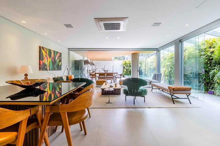 No pavimento intermediário temos a área social com um amplo living para 02 ambientes: sala de estar e jantar, cozinha em conceito aberto com uma ilha e área de refeição, quarto de hóspedes, som ambiente e lavabo.