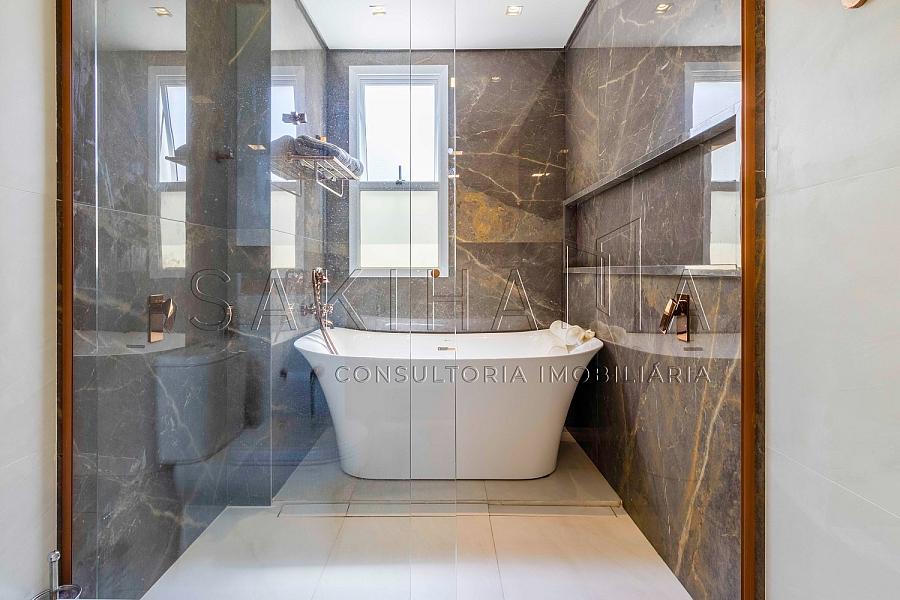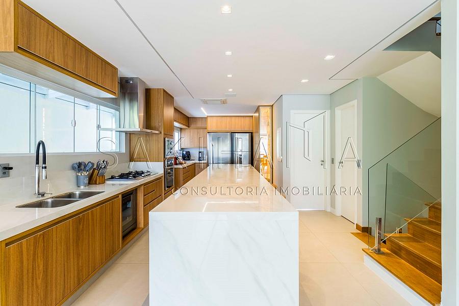 No pavimento superior temos sala de TV, 03 amplas suítes com persianas automatizadas, sendo a principal com 02 closets, banheiro com chuveiro e cuba dupla, área de banho e banheira de imersão, terraço.